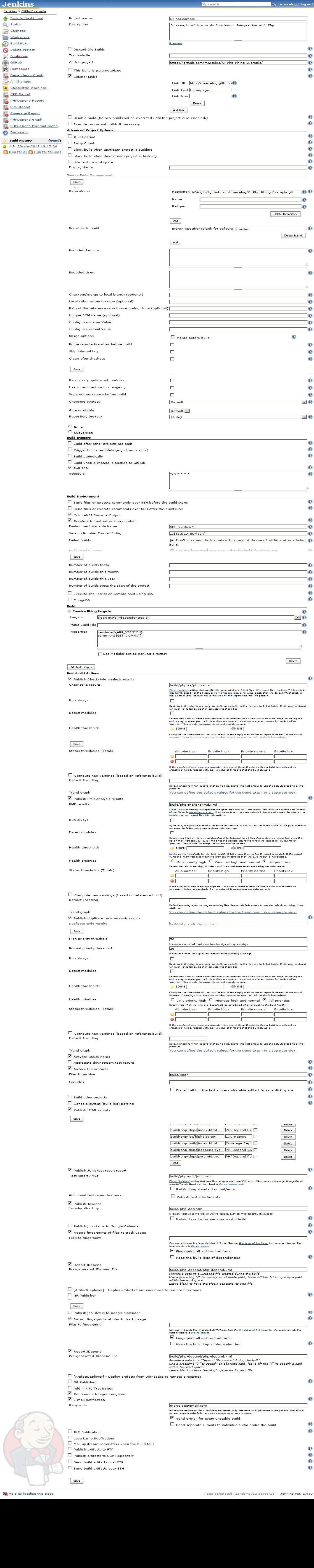 Configure the job and trigger a build. The 1st build will fail because php.properties is missing, so get into the jenkins workspace and setup the configuration as we did above. Then trigger a new build, which should be successfull.